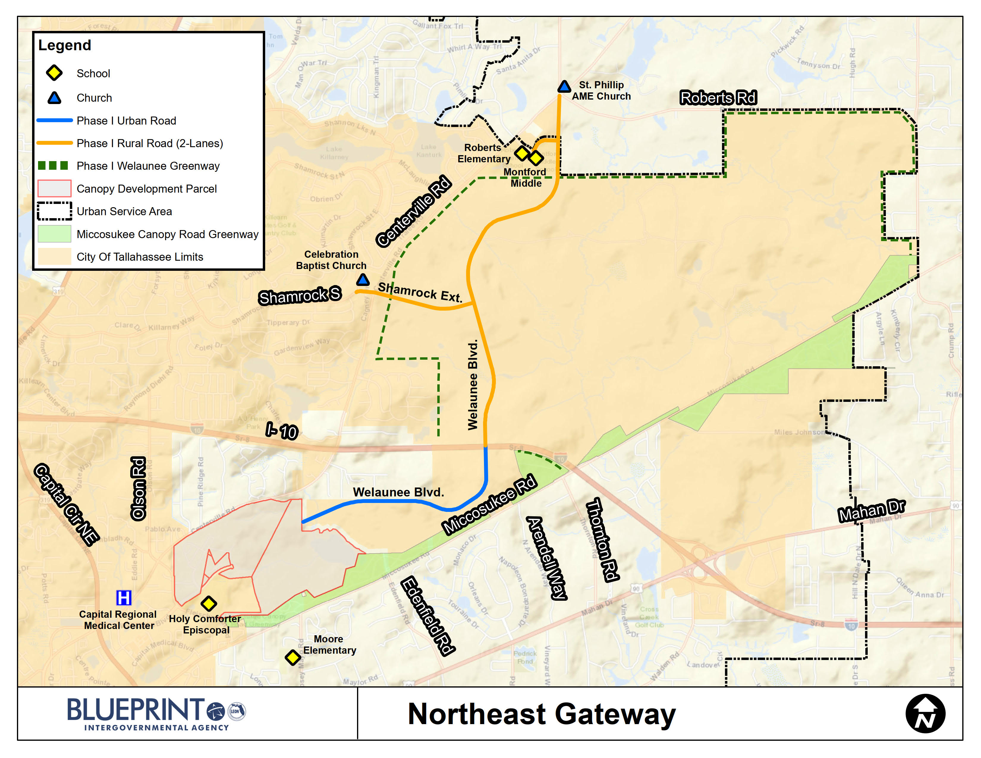 Since the June 15, 2021 approval of the NE Gateway PD&E Study, Leon County-City of Tallahassee Blueprint Intergovernmental Agency (Blueprint) has made significant progress in the design phase of the project. The project has been separated into two phases. Phase 1 includes Welaunee Blvd. south of Interstate-10 (I-10) and the bridge over I-10. Phase 2 includes Welaunee Blvd north of I-10, Shamrock Street Extension, Pimlico Extension, the Northeast Park Access Road, and the Welaunee Greenway. 60% Design Plans have been completed for Phase 1 including Welaunee Boulevard and the I-10 Bridge, and are nearing completion for the Phase 2 Roadway. Right-of-Way acquisition and coordination with affected property owners has been initiated. FDOT and FHWA have approved the new overpass bridge over I-10. Construction of Phase 1 is anticipated to begin in Summer of 2023.